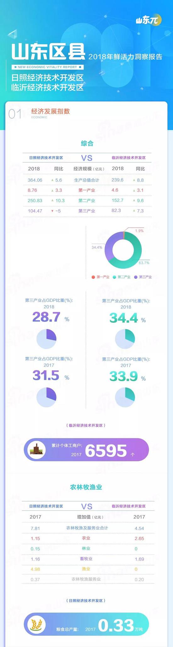 临沂开发区地区生产总值达到239.6亿元,低于日照开发区100多亿元,但增幅相对高,较去年同期提高8.8个百分点。其中,第一至三产业分别为4.6亿元、152.7亿元、82.3亿元,第三产业占GDP比重达到34.4%,超过三分之一,经济发展指数显著提升。