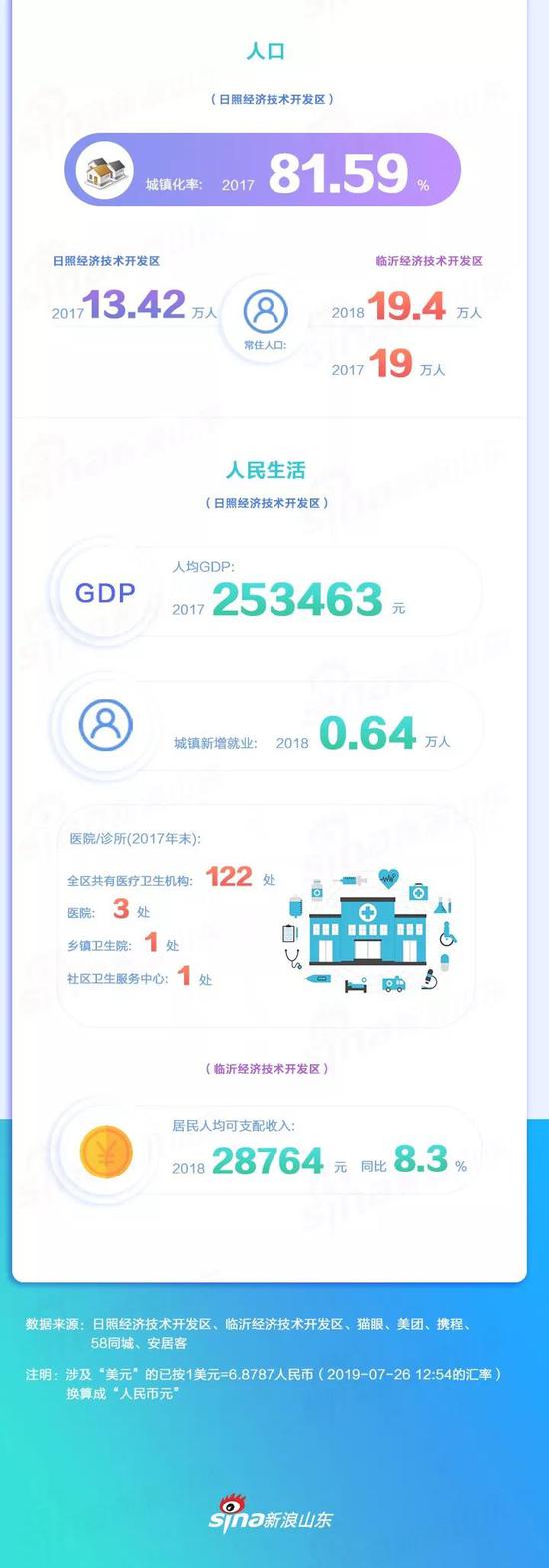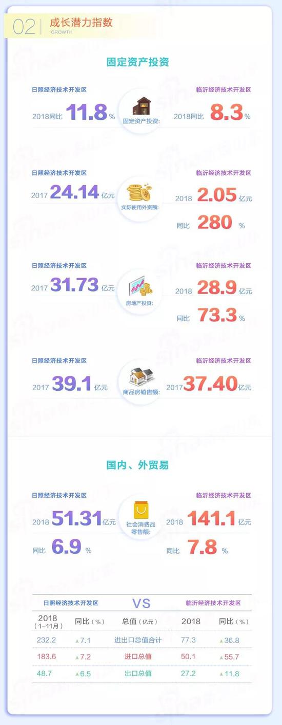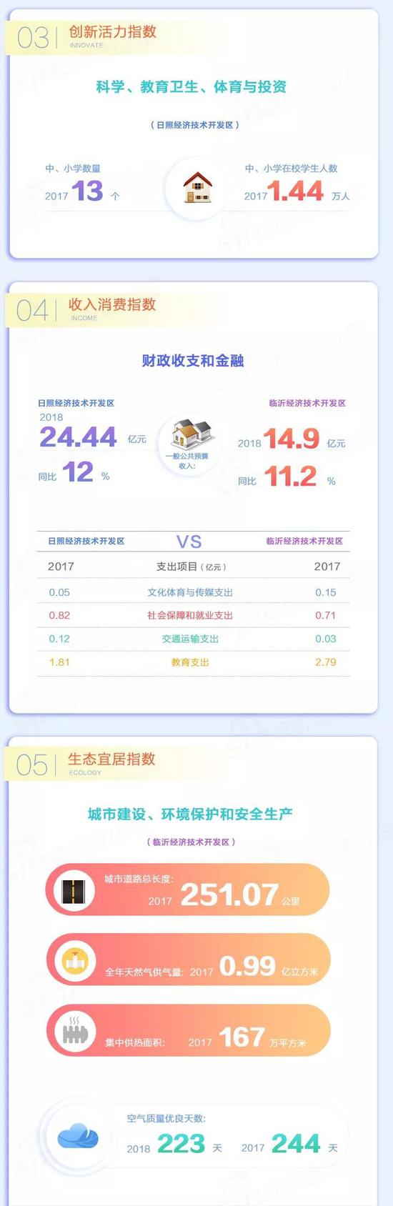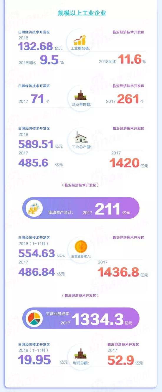 2018年,临沂开发区常住人口达到19.4万,居民人均可支配收入达到28764元,同比增长8.3%。临沂开发区一般公共预算收入14.9亿元,同比增长11.2%。而日照开发区更高些,一般公共预算收入达到24.44 亿元,同比增长12%,临沂开发区收入消费指数表现更佳。