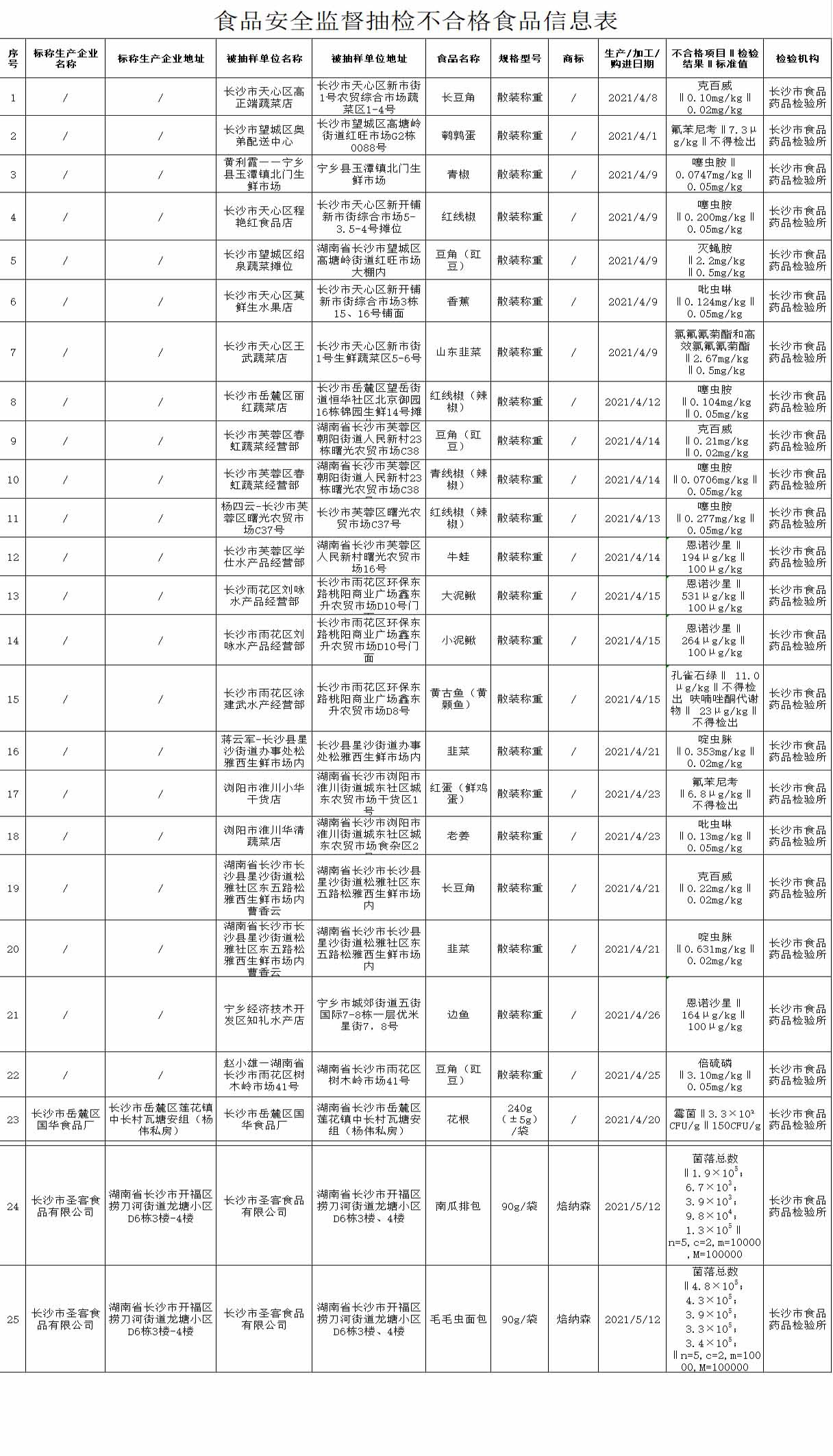 记者今天从长沙市市场监督管理局了解到,近期,该局组织开展对食品生产、流通、餐饮环节涉及的粮食加工品、茶叶及相关制品、酒类等25个食品大类1302批次样品进行了食品安全抽样检验,根据食品相关标准检验和判定,其中1277批次样品抽样检验项目合格,25批次样品不合格。